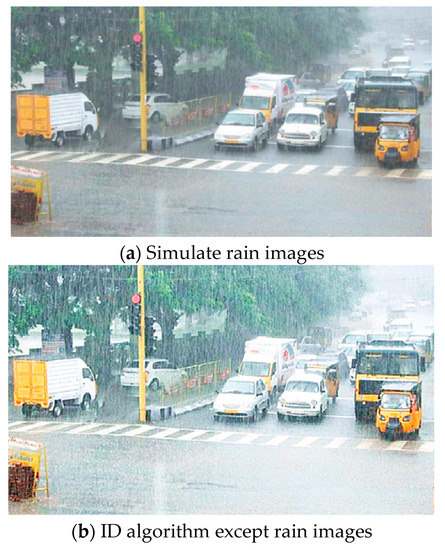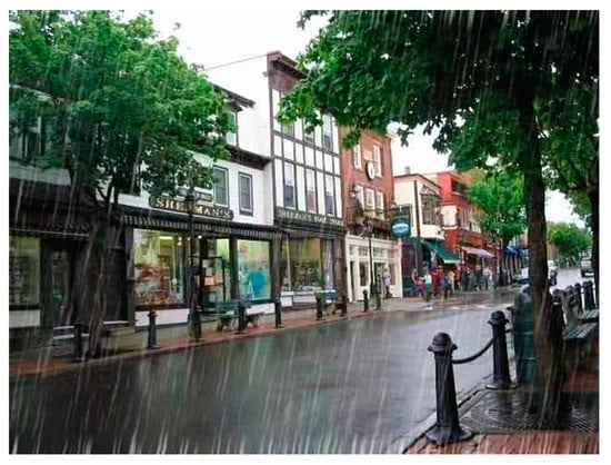 - Zhu, Z.C.; Li, B.; Fang, S. A restoration algorithm for rain video image. J. Hefei Univ. Technol. Nat. Sci. 2011, 34, 1011–1014. [Google Scholar]