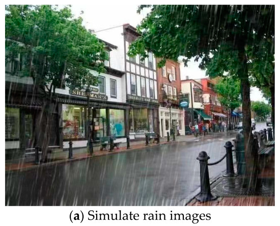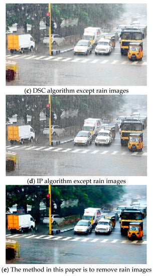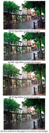 Figure 6a represents the unprocessed original picture, Figure 6b represents the image processed by the ID algorithm. Figure 6c represents the image processed by the DSC algorithm. Figure 6d represents the image processed by the LP algorithm. Figure 6e represents the image processed by the algorithm in this paper. It can be seen from Figure 6 that there are still raindrops in the ID rain removal algorithm that are not removed cleanly, and the texture of image repair is fuzzy; some high-frequency information is lost in DSC algorithm, and the effect of raindrop removal is not good; raindrops can be seen clearly in IP rain removal algorithm, the image color changes, and the overall image is distortion. Although the convolution neural network model proposed in this paper is trained by using the synthetic rain map data, the proposed algorithm still has a good effect on the real rain image. It can be found from the graph that the algorithm proposed in this paper can effectively remove the rain stripe on the real rain graph even when the rain stripe is obvious.