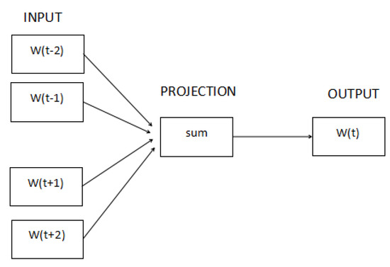 Continuous bag of words model(CBOW) is a highly efficient shallow neural network algorithm. It is developed to generate vector representations of a language vocabulary so that the information of the words is encoded in the vector space structure [20]. Essentially, the continuous bag of words model is similar to the feedforward neural network language model (FFNNLM) [25]. FFNNLM is firstly proposed by Bengio et al., which applies the feedforward neural network (FFNN) into the language model and learns a distributed representation for words to solve the problem of high dimensionality. However, the non-linear hidden layer of the model is deleted and the projection layer of the model is applied for all words. That is to say, the continuous-bag-of words model is a simple neural network with three layers: input, projection, and output. The working principle of the model is shown in Figure 1.