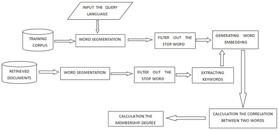 In this section, we use the continuous bag-of-words model to train word embedding, and we replace word frequency with word embedding to compute the relevance value between the word and each item of the query language. The modified cosine distance of word embedding is the tool of measuring the correlation degree between two words. The distance between two words satisfies the property of symmetry. Let , be the vectors of any two words in a retrieved document, the relevance value between and are defined as: