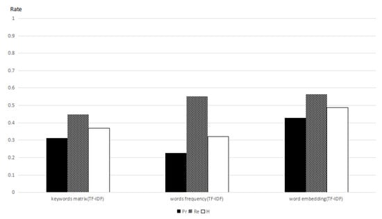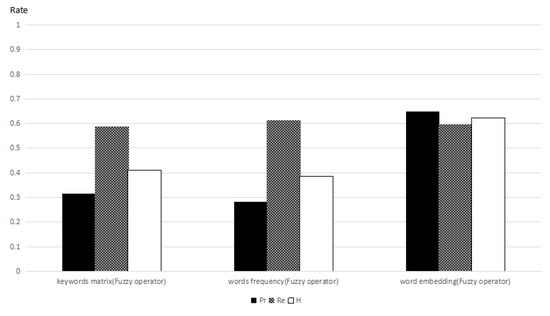 In the following, we use the modified cosine distance of word embedding, word frequency, and the keyword connection matrix to get the weights of words. Then, we employ, separately, term frequency, the inverse document frequency, and Equation (7) to be the membership functions to obtain the document sorting results that are calculated by three different weights of words. Concurrently, we compute their precision ratio, recall ratio, and the harmonic mean of the two ratios. In Figure 3, the harmonic mean of the precision ratio and recall ratio computed by word embedding is 48.68%, when we use Equation (2) as the membership function. In Figure 4, the harmonic mean of the precision ratio and recall ratio computed by word embedding is 62.23%, when we use Equation (7) as the membership function. We can see that the ratios that are computed by word embedding are radically better than the others.