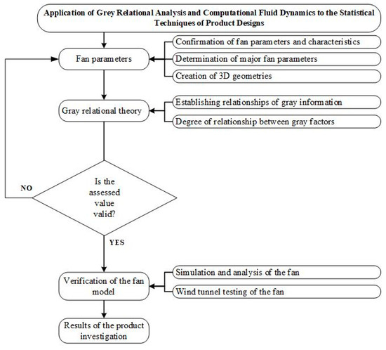 Gray relational analysis is utilized in this study to establish the relationship between the indeterminate and gray zones of parameters for fan products. From the results of related methods, the optimal approach for the parameter analysis of a product can be determined by the results obtained. The flow chart of this study is shown in Figure 1. It includes the principles for the calculation of GRA. When using GRA to assess each of the fan parameters, a value is considered valid if it surpasses the threshold value of 0.7, which is recommended.