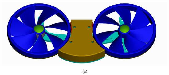A schematic diagram of a symmetrical dual-impeller fan model in a case study is shown in Figure 2a, in which the initial impeller diameter is 80 mm. The main components, including the impellers, motors, and the base, are shown in Figure 2b, which is an exploded view of the fan model.