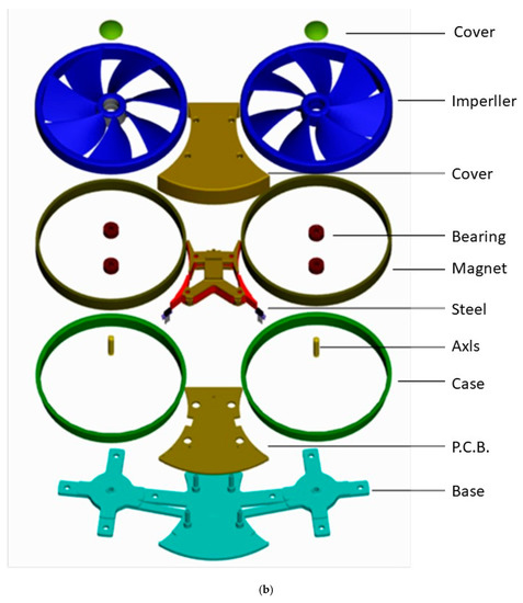 Fan parameters: (a) assembled dual-impeller fan; (b) exploded view of dual-impeller fan.