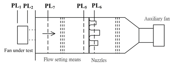 Regarding the measured pressure difference between the nozzle outlet and inlet ( and ), the flow rates on the cross-sections of nozzles shown in Figure 3 can be obtained by the nozzle coefficients. For the calculation of the outlet flow rate of the fan under test, the effect of density variations must be considered.