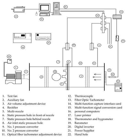 In terms of performance measurement, the detailed installation and operation of measurement equipment and instruments are described as follows. Regarding the fan performance measurement equipment, the fan performance test body used in this paper uses the AMCA 210-99 standard export wind tunnel, mainly including the main body. The main functions of the rectifier plate, multi-nozzle, and air volume adjustment device are to simulate the air flow conditions downstream of various fans, and to provide a good and stable measurement flow field, so that a complete performance curve can be obtained.
