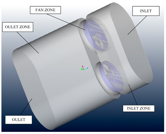 As shown in Figure 6, a numerical model of the dual-impeller fan was built for the case study. The dimensions of the inlet and outlet zones were determined based on the recommended values in order to reflect a real scenario of no impedance to the air flow into the ambient.