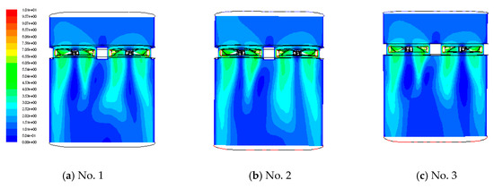 The results of numerical simulation make it easy to understand the aerodynamic characteristics and the flow field of fans, which serve as the foundation for further investigation, analysis, and improvement. The contours of pressure, as shown in Figure 8, allow us to better understand the influence of pressure on the entire system in the flow field being analyzed as well as the velocity distribution of the fluid at the centerline section.
