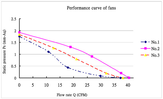 With a fixed amount of power, the flow rate varies inversely proportional to the output air pressure. Since the efficiency of fans changes as the flow rate varies, a non-linear relationship between the flow rate and the air pressure exists, and this forms the performance curve of fans [26]. The measurement process is shown in Figure 4.