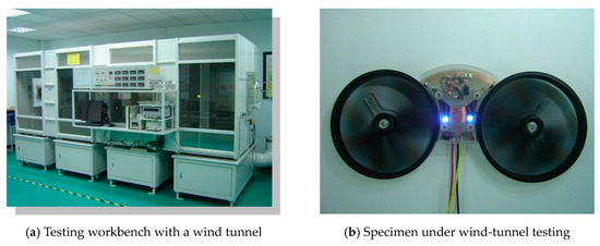 - Turn on the thermometer, hygrometer, barometer, fiber-optic tachometer, and inverter one hour before measurement. Make sure the equipment operates at a stable state. A testing workbench with a wind tunnel is shown in Figure 10a. The fan to be tested is mounted on the front plate of the main chamber. Care should be taken to ensure that the fan is sealed adequately to prevent leakage.
