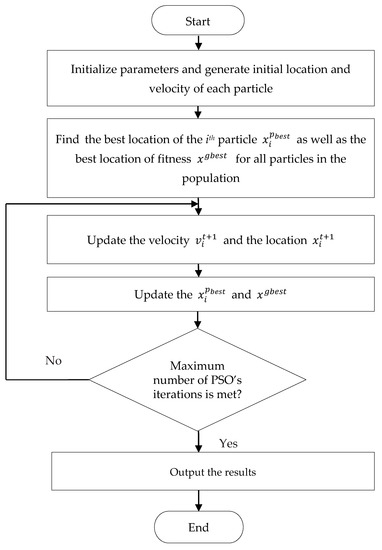 In Equation (4), denote the velocity of the ith particle in iterations and is the inertia weight, and are learning factors, and are random numbers between [0, 1] in iteration , is the best location of the ith particle, and is the best location of fitness found by all particles in the population. In Equation (5), and denote the location of the ith particle in iterations and . A flow chart of PSO is shown in Figure 2.