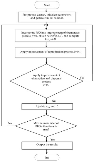 - The proposed algorithm provides a better classification effect because PSO is incorporated into the improved chemotaxis process. PSO has memory and global search abilities, so we first used particles for global search and then treat these particles as bacteria, and the chemotaxis operation improved the global search ability. The PSO algorithm introduced in this paper only uses its global operation and uses the memory of PSO to improve the bacterial search ability. In the improved reproduction operation, the crossover operator is introduced to the replica parent to increase the diversity of the population while the best individual is retained. In the improved elimination and dispersal operation, the (1 − ) replaces in the original BFO, and is introduced to prevent the population from dying and falling into a local optimum.