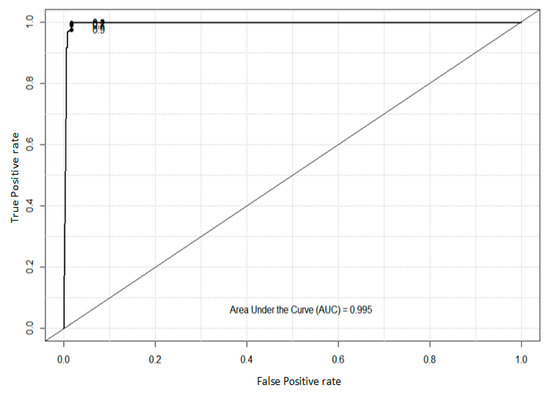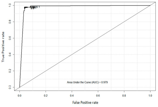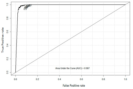 In this experiment, the area below the ROC is also called the AUC and is used to evaluate the performance of the proposed approach. The value of the AUC is from 0 to 1.0, and the closer to 1.0, the better the effect of the model classifier. The value of the AUC is 0.979 for the ovarian cancer microarray data, as shown in Figure 4. The value of the AUC is 0.987 for the spam email dataset, as shown in Figure 5. The value of the AUC is 0.995 for the zoo data, as shown in Figure 6. Hence, the experimental results show that the proposed algorithm has good classification performance.