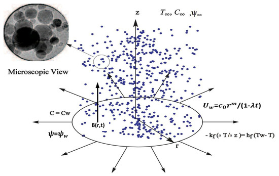 Let us consider an unsteady magnetohydrodynamic flow of incompressible viscous flow of nano-fluid over a nonlinear stretching sheet, with . The flow of the conducting fluid is assumed to be in the radial direction , where , are dimensional constant. The temperature of the sheet is regulated by a convective heating process characterized by hot fluid temperature and variable heat transfer coefficient , solutal concentration, and nanoparticle concentration represent ( and , respectively). The ambient values of the temperature, solutal concentration, and nanoparticle concentration are denoted by , , and , respectively (see Figure 1). denotes the variable magnetic field intensity where t is time. The magnetic field acts normally to the sheet in the positive z-direction and generalizes the magnetic field term previously given in [26] to . is the uniform strength of the magnetic field, is the power-law index, and denotes the unsteadiness parameter. Under the above conditions, the governing equations of continuity, momentum conservation, energy conservation, and nanoparticle volume fraction can be expressed as (see [12,27]):
