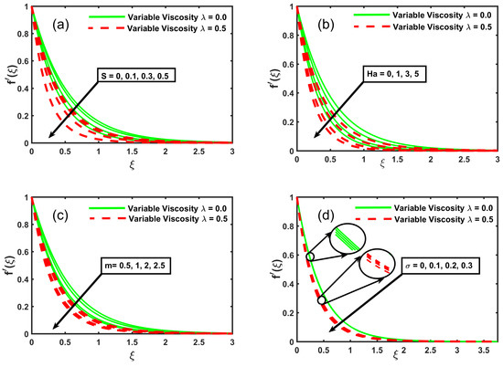 Figure 2a shows the effect of the suction S and variable viscosity parameters. In the velocity function, the decline is observed when the suction is and the fluid velocity is decreased for . Figure 2a depicts that the fluid flow velocity displays a decreasing trend with the rising values of . The reason behind this is the rise in viscous effects with a higher viscosity, which decreases the fluid flow as a result. In addition, the thickness of the momentum boundary layer has been perceived as an enhancement. Likewise, with the impacts of the magnetic field, one can observe retardation in the velocity activity (see Figure 2b). This is because of the forces of Lorentz, which act as resistive forces and thus oppose the movement of fluids. Therefore, the magnetic field manages the fluid flow successfully. Figure 2c shows the variation of stretching sheet parameter m on the fluid velocity. The magnitude of the velocity’s radial component decreases as m increases. m, in contrast, has a significant impact on and the velocity components u and w, respectively. A similar trend is observed in variable viscosity . Figure 2d shows that, with rising values of , the velocity profiles decrease, and a similar trend is observed for the growing value of the viscosity variable.