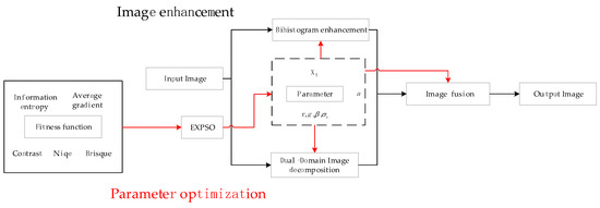 The idea of image enhancement in this paper is to improve the image contrast by using the method of bi-histogram enhancement and improve the image edge details by using a dual-domain image decomposition method. The fitness function is constructed by combining the advantages of the two, and EXPSO is used to optimize the parameters to find the optimal parameters and obtain a better visual effect. The flow chart of the method is shown in Figure 3.