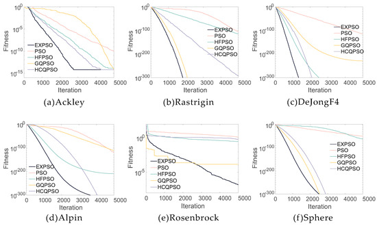 Six function optimization problems were used to test the performance of the proposed EXPSO algorithm. The functions are shown in Table 2. The dimension of the function is 30. The proposed algorithm was compared with PSO [4], HFPSO [45], GQPSO [46], and HCQPSO [47]. The results are shown in Figure 4. It can be seen that the EXPSO algorithm in this paper has certain advantages in convergence accuracy and convergence speed.