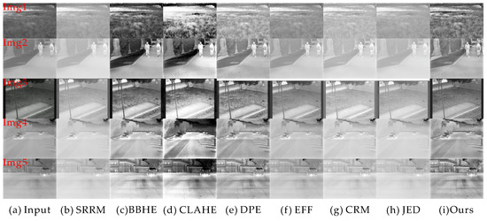 To verify the effectiveness of the proposed algorithm, state-of-the-art methods were selected, namely SRRM [48], BBHE [30], CLAHE [39], DPE [34], EFF [49], CRM [50], and JED [51], and publicly available datasets were used, namely OTCBVS Benchmark Dataset [52] and FIR Sequence Pedestrian Dataset [53]. Information entropy, Average gradient, Constrast, Niqe, and Brisque index were used as the objective evaluation factors. The experimental results are shown in Figure 5. It can be seen in the figure that the contrast of the original image is relatively weak. The image contrast is not significantly improved after processing by the algorithms show in Figure 5b,f–h. Figure 5d is the processing result of CLAHE algorithm, with good contrast, but details are lost. For example, the upper left corner of Img1 is too bright, resulting in details being lost, and the ground is too bright and the grass is too dark in Img2. Figure 5c,i presents good visual effects. It can be seen from Img1 and Img2 that the overall brightness of the algorithm in this paper is higher than that of the algorithm shown in Figure 5c. The algorithm in this paper can enhance the contrast while preserving the details and texture of the image.