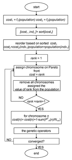 Figure 1 shows a flowchart of this Pareto genetic algorithm. This approach allows an easier way to trade off the infinite number of optimal solutions to the MOO problem. The Pareto genetic algorithm introduced here works with two fitness functions. It can be easily modified to work with more. A Pareto solution needs a large population size to work well since it is trying to define the Pareto front. Accordingly, we only include the tournament selection and mutation operator in the genetic algorithm. More details are described in the literature [69].