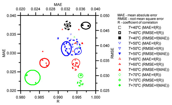The set of the best solutions for 70 °C shows the smallest RMSE = 0.0276 for ID 70-6_3 and ID 70-6_7. The result of MAE minimization is ID 70-6_4 (0.0216), with the solutions for ID 70-6_2 and ID 70-6_5 (0.0217, differences 0.0001).
