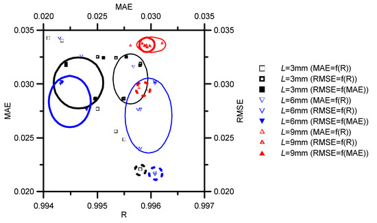 Statistics for Pareto optimal sets at T = 70 °C and various thicknesses are presented in Figure 3. The Biot number calculated for 6 mm slices, dried at 70 °C (ID = 70-6_4) has the best statistical values (see Table S1 and Figure 3). In this case, the smallest MAE = 0.0216 and the largest R = 0.9961 were obtained. The statistical results for the slices of 6 mm dried at T = 70 °C are larger than for the other thickness (see Figure 3). The Pareto set of the best solutions as for as the slices of 9 mm are considered shows the smallest dispersion (see Figure 3).