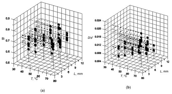 Pareto optimal sets for (a) mass Biot number (Bi) and (b) mass diffusion coefficient (D/s2); L – characteristic dimension, s – half of plane (slice) thickness, T – temperature.