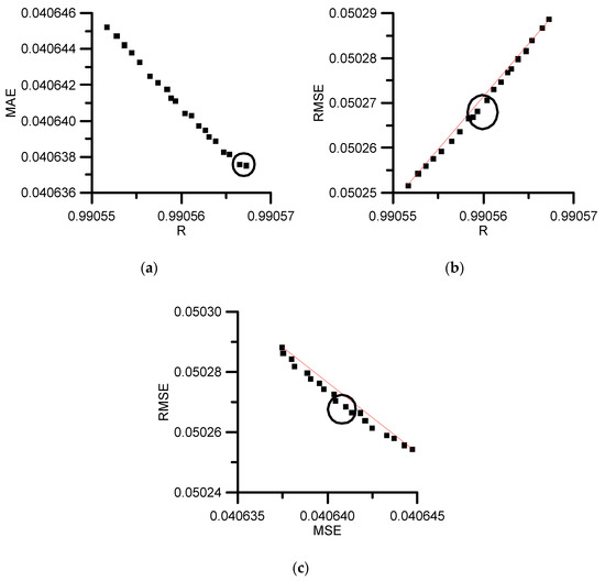 Pareto optimal sets for constants in Equations (6) and (7): (a) MAE = f(R), (b) RMSE = f(R), (c) RMSE = f(MSE).