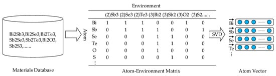 We obtained more than 73,452 binary, ternary, and quaternary inorganic compounds from the Materials Project database [], and then generated a sparse atomic environment matrix. The SVD of the matrix was used to pair the columns, which were then compressed, and the singular vectors corresponding to the largest 20 singular values were taken, while each element was described as a 20-dimensional vector. Obviously, elements with similar properties would have similar row vectors in the atomic environment matrix, generating similar atomic vectors.