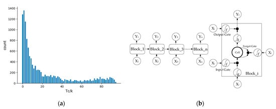 (a) Tc distribution of superconductors; (b) long short-term memory neural network (LSTM) architecture.