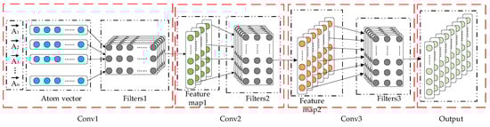 CNN is a neural network specially used to process data with similar network structures. It was originally applied in the field of computer vision to extract local features [,]. CNN networks achieved significant results in tasks such as natural language processing, speech recognition, and face recognition [,,], indicating that CNN has the ability to independently extract features. Due to the extremely complex crystal structure and the interdependence between atoms, it is often difficult to determine the interatomic dependencies from complex structures by relying on experts or prior knowledge. Therefore, this paper uses the CNN model (see Figure 3) to extract short-dependent feature relationships between atoms of crystals.