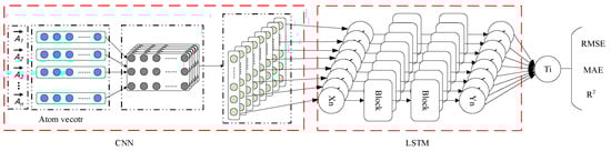 In the superconductor research field, the most comprehensive database is the Supercon database [], which contains the compositions and the Tc of 30,057 metallic oxides or 514 organic superconductors as of April 17, 2019. In the past decade, these materials databases were applied to data-driven material informatics researches [,,,,,]. Indeed, these large data sources spurred researchers’ interest in applying advanced data-driven machine learning (ML) techniques to accelerate the discovery and design of new materials with selected engineering attributes [,,]. Following this strategy, Stanev et al. [] recently used Magpie [] descriptors to characterize superconductors into 132-dimensional vectors and used the random forest (RF) algorithm to develop a Tc prediction model. Hamidieh et al. [] used the same characterization method to establish a Tc prediction model for superconductors using 21,263 materials from SuperCon using a gradient boosting decision tree (GBDT). However, these methods of describing materials either only consider the type and number of constituent elements (One-hot), or only consider the attributes of constituent elements in isolation, and they do not consider the environment in which the constituent elements exist and the order dependency of the elements. The existence of the element’s environmental and order dependencies often greatly affects the properties of materials. Based on this, this paper proposes a method that uses atomic vectors [,] to describe materials and uses an HNN model that combines a convolutional neural network CNN and long short-term memory neural network (LSTM) to predict Tc. The HNN model uses CNN to extract the short-dependence feature relationships between atoms, and the LSTM extracts the long-dependence feature relationships between atoms. The contributions of this paper can be summarized as follows: