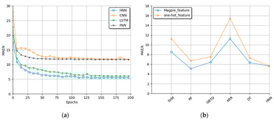 Figure 5a shows the changes in MAE values of all neural network models with the increase in the number of training epochs. Among them, the HNN model proposed in this paper obtained the minimum MAE value of 5.631 k after training 200 generations. At the same time, we can see that our model stabilized after about 80 generations, and the convergence rate was higher than that of the other three baseline models.