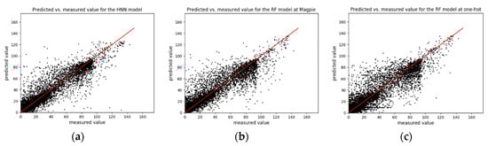 At the same time, the results of these two methods were better than other conventional machine learning algorithms when using one-hot feature description. Figure 6 shows the predicted results of the three material description methods using the best model on the test set. The abscissa represents the measured value, and the ordinate represents the predicted value. Comparing Figure 6a–c, we find that the results in Figure 6c were the worst. The predicted value of the Tc between 60 k and 100 k using the Magpie feature and RF method was generally lower than the measured value. The HNN method in this temperature range was better than the RF method. However, the predicted value of superconductors using the atomic vector combined with the HNN method at a Tc of 40 k–60 k was more accurate than the RF method, and its predicted effect was not as good as that of the RF method.