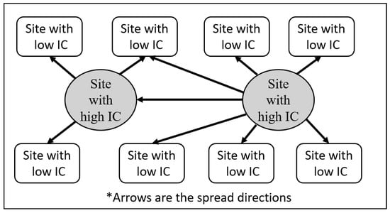 Let the sites with ICs bigger than 1 be the high infectious points (HIPs) and the remaining sites be the low infectious points (LIPs), since, in PEIC (3), a site can lead to an increase in the number of infections due to and an decrease as . Then, we can define the key HIPs (KHIPs) as being the HIPs of a year and each of them can reach at least an HIP of the next year within a certain distance (we use 150 m in our case study in Section 4). The key LIPs (KLIPs) are the LIPs of a year and each of them cannot reach any HIP of the next year within .