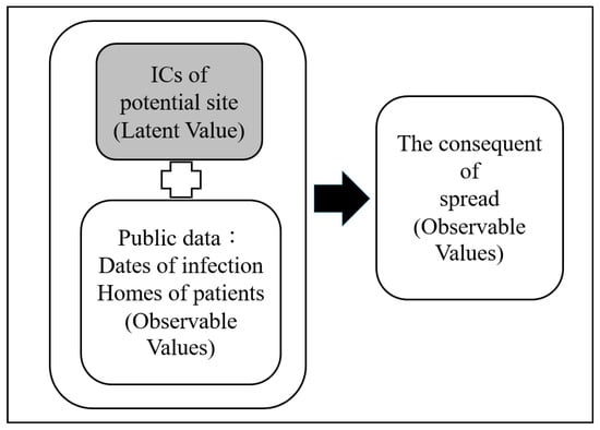 where denotes the potential site on day . It is noted that the home of each patient in the public data is considered as one potential site. Value is 1 if the data shows that a patient lives in potential site and was found on day ; otherwise, is 0. Then, let be a vector with length and represent the outcome of the spread of dengue fever after the day. Finally, let and denote the latent IC of potential site . Since represents the IC of site , we can assume that . The mathematical model connecting the public data and the ICs can be written as Equation (2).