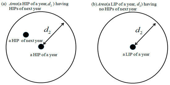 Then, the recurrence rate and the retaining rate are defined to evaluate the reliability in this subsection. Let be the collection of circle areas whose centers are the points of set and the radius is . The schematic diagrams of having HIPs of and having no HIPs of are shown as Figure 3a,b, respectively.