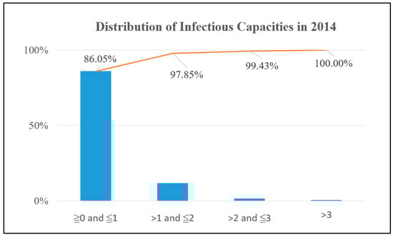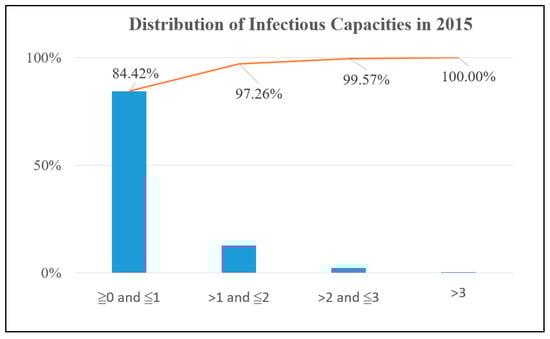Let be the average of the numbers of daily reported patients on the three consecutive days after day . We assigned , , and , and is equal to the original point. Then, the iteration starts from an whose each element is 1 and stops as . There are 5262 potential sites for 2014 and 6523 for 2015. We noted that the x-axis of Figure 4 and Figure 5 represents these different ranges of ICs and the y-axis is the proportion of these sites with ICs being in a certain range for all potential sites. The potential sites are distributed almost anywhere in downtown Kaohsiung for both years. However, only 13.95% of the potential sites have an IC above 1 in 2014, as shown in Figure 4, while the value is 15.58% in 2015, as shown in Figure 5. Therefore, if the result is accurate, then the authority only needs to focus on improving the environment of around 15% potential sites.