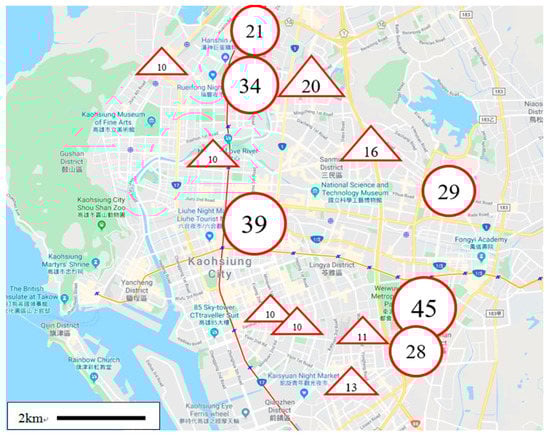 Then, as presented in the description of step 5, we grouped the KHIPs by putting two KHIPs in the same group if the distance between them was less than 150 m. The KLIPs were also grouped using the same method. The distribution of the numbers of a group of KHIPs is shown in Table 3, while the distribution for KLIPs is shown in Table 4. As can be seen in Table 3, there are 9 groups with more than 10 KHIPs, and 8 of these 9 groups are located in the downtown area of Kaohsiung City. The positions of these 8 groups are indicated in Figure 6 with triangular symbols. In addition, as can be seen from Table 4, there are 9 groups with more than 20 KLIPs and 6 of them are located in the downtown area of Kaohsiung City. The positions of the 6 groups are also shown in Figure 5 with circular symbols.