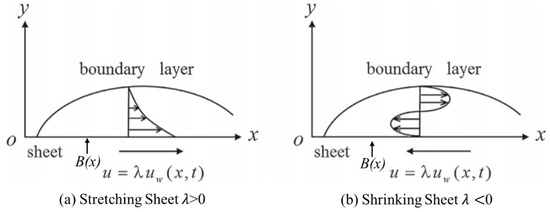 Let us consider an unsteady MHD incompressible flow of the / water nanofluid flow on a stretching/shrinking sheet in the presence of thermal radiation effect. Figure 1 shows the physical model and coordinate system of the concerned problem. The velocity of wall mass transfer is where is a positive constant. It is also assumed that the flow is subjected to a transverse magnetic field of strength where is the constant applied magnetic field. By including the considered assumptions, the equation of mass, momentum, and energy in the form of a boundary layer are expressed in Tiwari and Das’ model [2], as below: