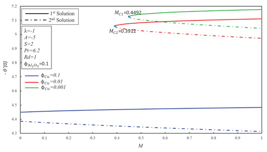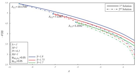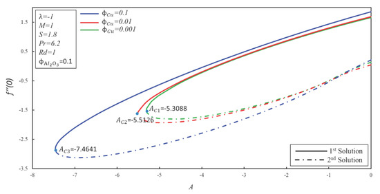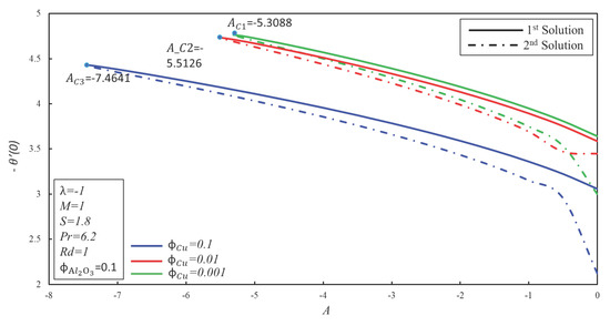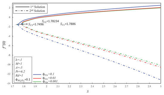 In this section, Equations (6) and (7) with boundary conditions (8) have been solved numerically by employing the shooting method in Maple software. The shooting method has been employed by many researchers [41,42,43,44]. As suggested by Devi and Deci [17], the solid volume fraction is kept as a constant in many graphs. Furthermore, the solid volume fraction is added in order to make the / water hybrid nanofluid. As recommended by Dero et al. [4] and Iqbal et al. [45], the Prandtl number is kept as constant and employed to produce the results of the current study. Table 3 shows the comparison of the numerical values of and with the published results of waini et al. [31] for Cu–water nanofluid. It is worth mentioning that Waini et al. [31] used the 3-stage Labatto IIIa formula in a BVP4C solver to solve the resultant similarity equations. It is found that the current results show outstanding agreement with the results of Waini et al. [31]. Therefore, it can be concluded that the accuracy of the present method is fine, and it can be used in this study. Figure 2 is demonstrated for the comparison purpose in order to check the accuracy of the used method. It is observed that the critical values of the current study have a good agreement with the critical values of published paper (allude Figure 6 in Waini et al. [31]). After comparison, this method can be used confidently in this problem.