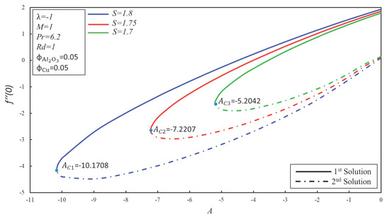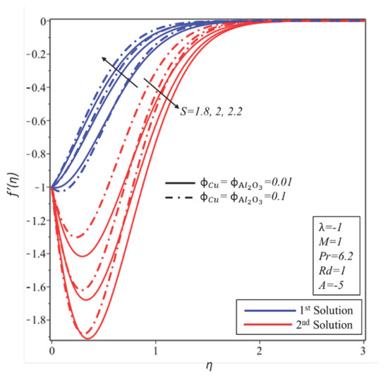 In detail, Figure 7 and Figure 8 show the variation of and with for the numerous values of the mass suction parameter . It is observed that the domain of the solutions increases along the critical value of moving to one side when the mass suction parameter is decreased. In light of our calculations, and are the respective critical values of for and . At the same time, it is examined that the smaller critical value is for as compared to and . Henceforth, boundary layer separation is delayed for the higher values of the mass suction . In addition, the coefficient of skin friction increases in the first solution with the developing of whereas it declines in the second solution. The expanding of prompts to rise the effect of the heat transfer rate in both solutions. Figure 9 and Figure 10 demonstrate the variation of and with for the numerous values of . It can be found that the increments in lead to smaller critical values of . According to our computation, and are the respective critical values of for and . Furthermore, the heat transfer rate rises in both solutions for the higher values of the mass suction This is due to fact that mass suction helps the molecules of the hybrid nanofluid to transfer the heat effectively. On the other hand, increases (decreases) in the first (second) solution when is enhanced.