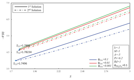 Figure 3 and Figure 4 show the variation of and against for , and . By keeping fixed, an expansion of creates a reduction in the heat transfer rate, which implies that the heat transfer coefficient is decreased on the sheet, while an opposite nature is observed for the in the second solution. On the other hand, the coefficient of skin friction decreases in the first solution. Moreover, it is noticed that multiple solutions exist for , whereas no solution exists for . It is worth mentioning here that is the critical value where multiple solutions exist. Variations of and along for numerous values of were drawn in Figure 5 and Figure 6, respectively. It is observed from them that when the solid volume fraction increases the values of the critical point of are also increased. Furthermore, are the respective critical values of for and . It is examined that the critical values of get smaller for higher values of the solid volume fraction , which is the physical reason of the extension of the thickness of boundary layer separation. Moreover, it can be seen that the values of rises in the first solution and reduces in the second solution when the solid volume fraction is increased. In the meantime, the rate of heat transfer decreases for the unstable solution and increases for the stable solution with the increasing of .