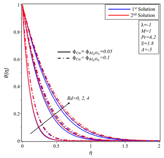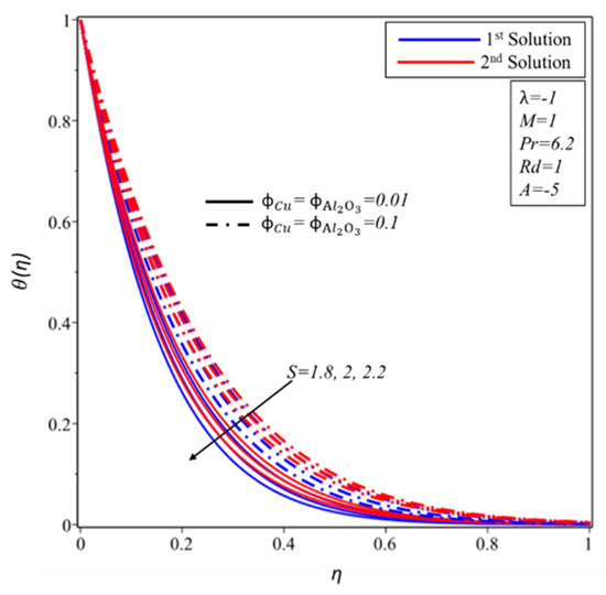 Figure 11 and Figure 12 illustrate the profiles of velocity and the temperature for S. It was demonstrated that the rise in decreases the velocity of the fluid in the first solution but it increases the velocity of the fluid in the second solution. On the other hand, it is perceived that the temperature of fluid decreases with the expansion of the mass suction . The effect of the thermal radiation parameter on is shown in Figure 13. It can be noticed that the thickness of the thermal boundary layer, as well as temperature of the fluid, increases with the increasing values of