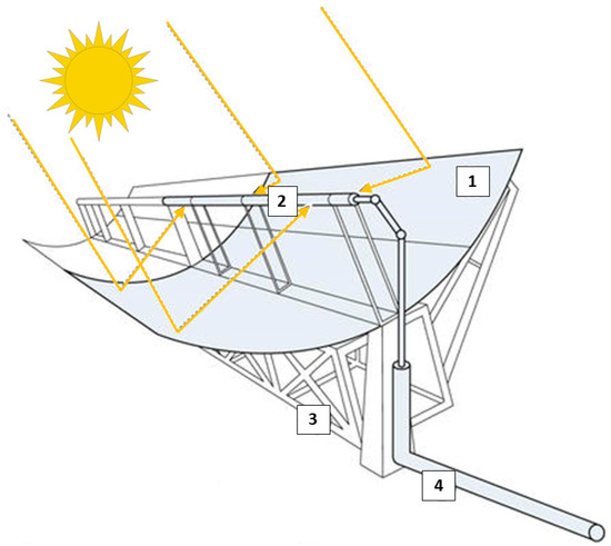 Scheme of working of a PTC facility. (1) Reflector; (2) Absorber tube; (3) Structure; (4) Solar Field Piping.