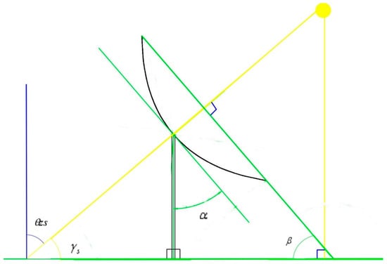 Afterward, the distance (d) to the shading for every point is calculated based on Equation (12), linking the tilt angle of the PTC corner, the length, and the sun height.