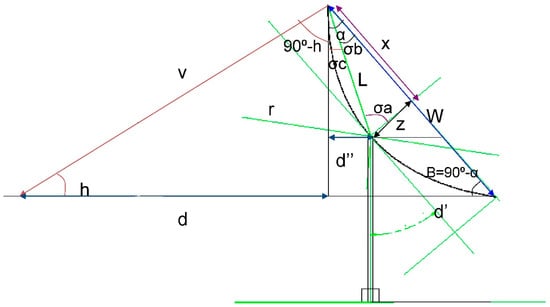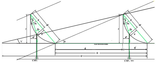 Table 1 shows the results obtained for each shadow of the three points (first and third) as shown in Figure 9 and Figure 10. These outputs are considered to be valid for every point in time at which the shading distance was calculated. The known angles H1 = 330°; H3 = 30°, angles (h1, h3), and distances d (d1 y d3) are computed, considering the dimensions of a standard PTC of the commonly used Eurotrough model [29] (the aperture plane size W = 5.760 m and focal distance f = 1.710 m) for the calculation of the distance of the vertex of the collector perpendicular to the aperture plane according to Equation (18), resulting in that z = 1.212 m.