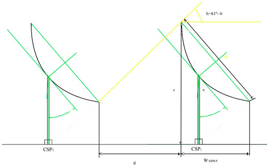 where the distance between the pylon can be obtained depending on the dimension’s collector, the angle from the vertical of the collector, the solar hour angle, and height, as shown in the following Equation (16). In short, the distance depends the dimensions of the collector and the location of the solar field.