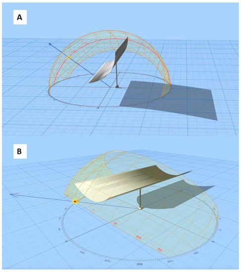 Proposed method: isometric view of PTC. (A) Shadowing at 10 a.m.; (B) Shadowing at 12 a.m.