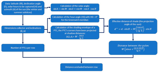 Figure 7 shows a flowchart of the methodology followed where from the data of the PTC field location and its dimensions and inclination, all the necessary data for the calculation of the distance between pylons without shadowing are calculated.