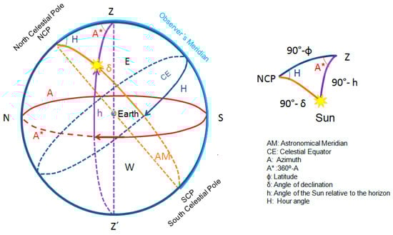 At a specific latitude, the height of the sun depends on the hour. To establish the height of the sun-latitude relationship, basic knowledge of celestial physics is used, where the planet Earth is located in the centre (Figure 8). The equatorial plane of the celestial sphere (NS) is the equatorial plane of the Earth, where the azimuth is positive when viewed from the north (A), A* = 360° − A, i.e., clockwise.